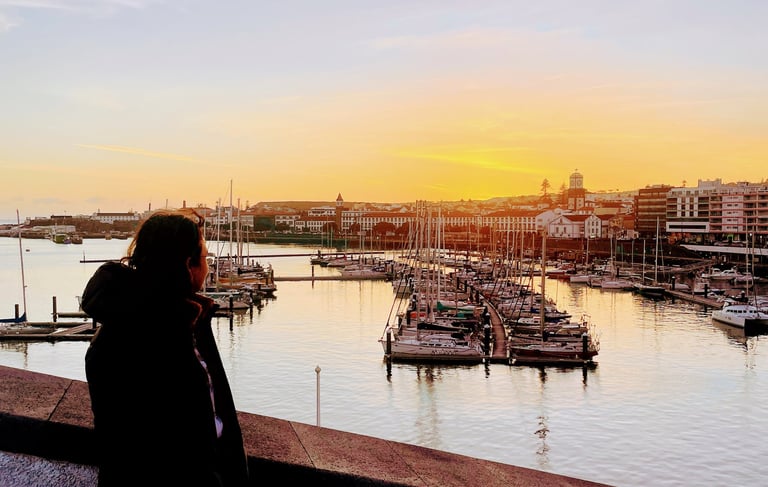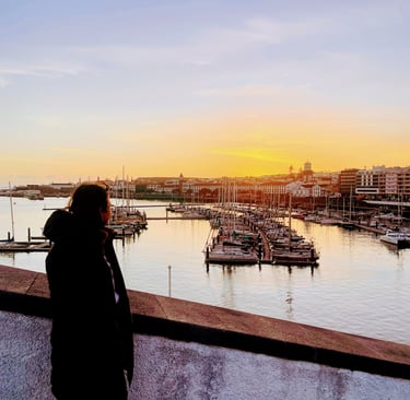 We ended the afternoon in Ponta Delgada, the capital. It's a genuinely charming city — monochrome volcanic stone mixed with brightly painted buildings and intricate mosaic sidewalks, the iconic triple-arched Portas da Cidade gates on the waterfront. We wandered the city center, had dinner, and called it a night.