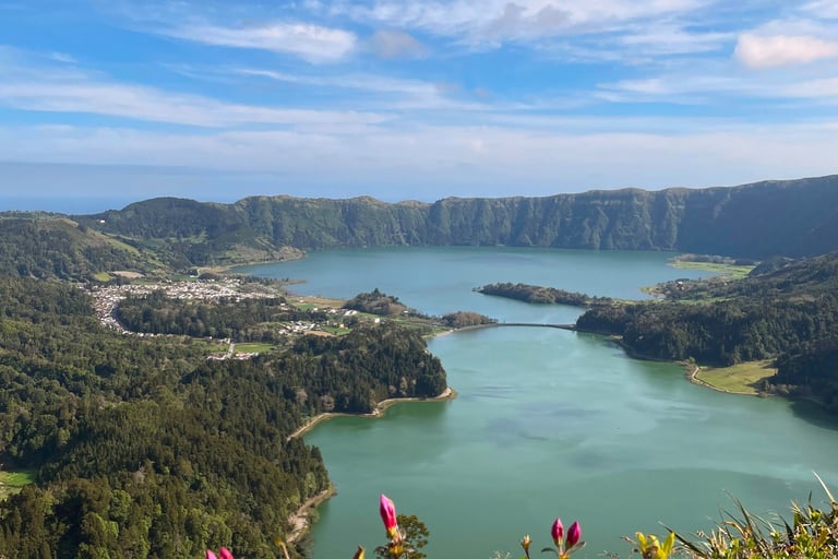 We started at Vista do Rei viewpoint, the classic panoramic view over the Sete Cidades crater lakes. One green, one blue, sitting side by side inside an ancient caldera. Get there early — the difference between 8:30am and 10:30am in terms of crowds is significant.